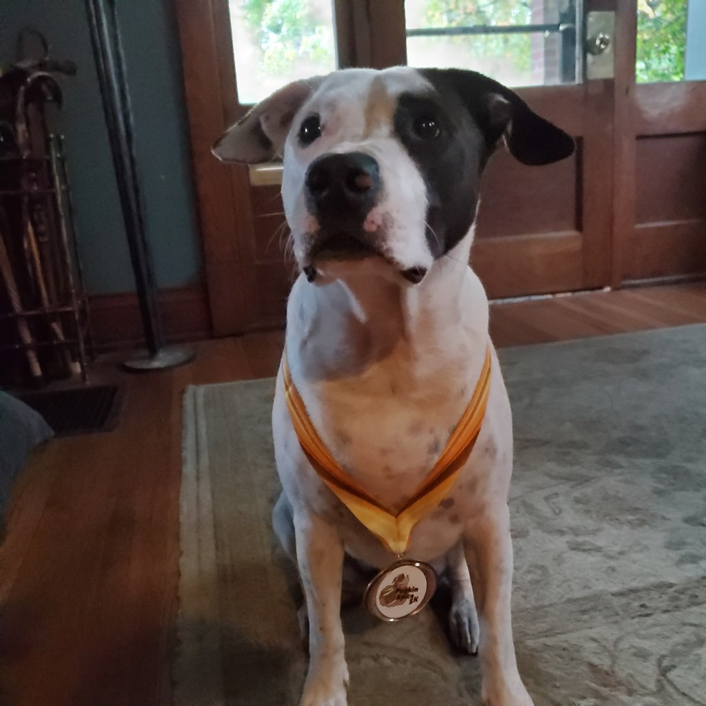 It was coming down steady at race time, so I donned my poncho. Camp went pee on command on the way to the start line because he is the best. The run was fine. Very wet, pretty fun. Thankfully it was mid 50s and no colder or I would be bitching nonstop about the temperature. The only thing of note–about 4 tenths of a mile before the finish, there is an exit out of the park. It is the exit I most often take when I’m in the park with the dogs, which is several times a week. Camp, who was completely and utterly soaking wet at this point and, keep in mind, *not a runner*, seemed to think that perhaps it was time to Later The Fuck Out Of This Noise And Go The Fuck To Our Dry Home. I enthusiastically told him NO! KEEP GOING GOOD BOY WE’RE ALMOST DONE! He said “bitch, I’ll show you how done I am.” He got slower and slower and I basically dragged a doggie anchor up the last hill.